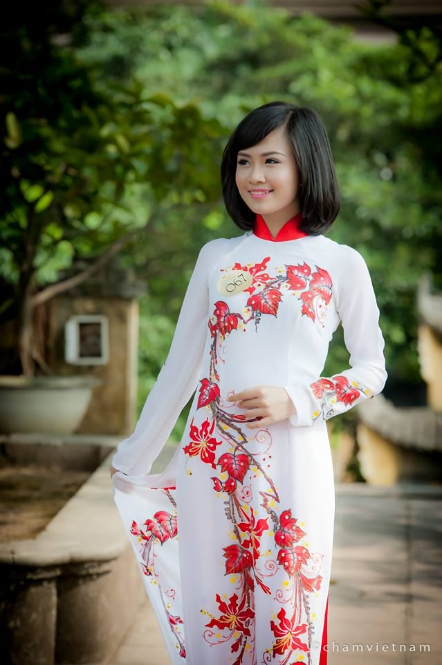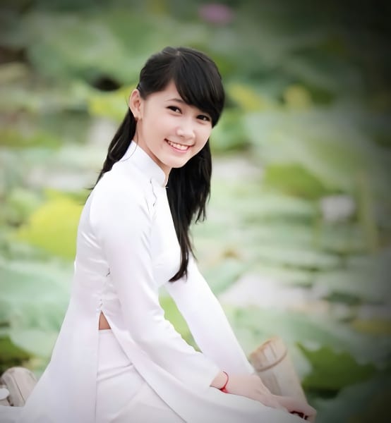 白いアオザイ姿で花を愛でるスタイル抜群のお姉さん。