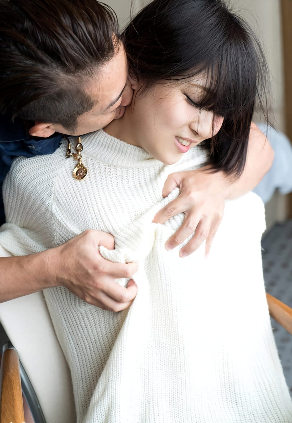 ニットセーターの上から胸を揉まれるショートヘア美女