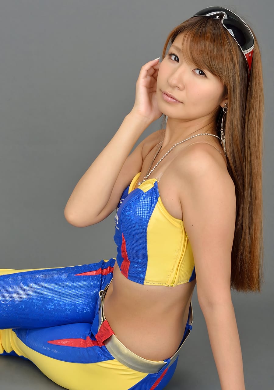 大きなイヤリングを付けて横座りしている美人レースクイーン