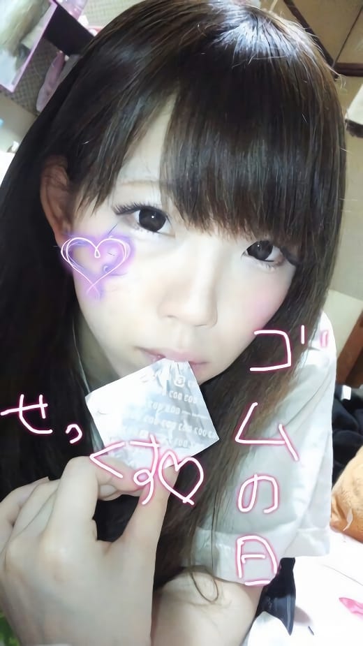 アニメ風のコスプレ姿でコンドームを咥えるロリ系美少女。