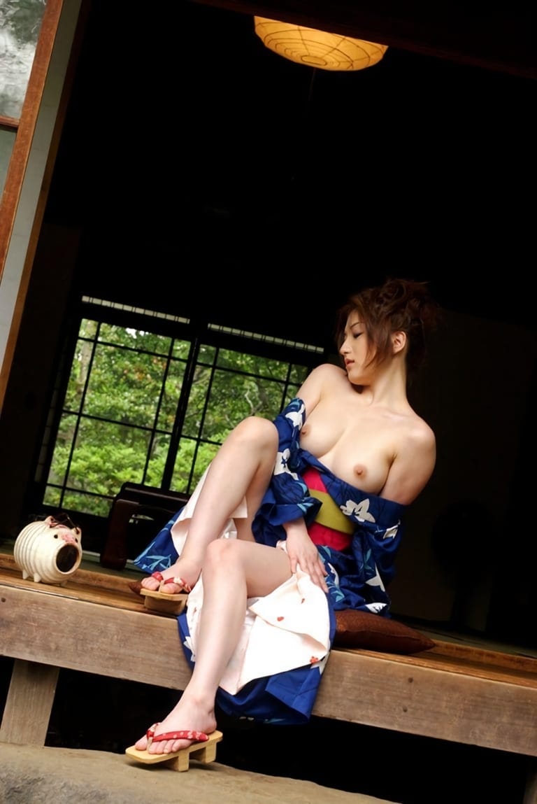はだけた浴衣姿でおっぱい丸出しで横座りするスレンダー美少女