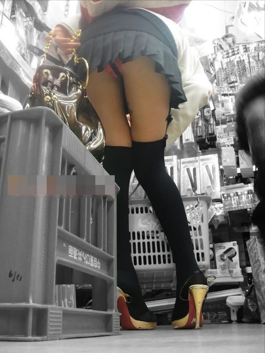 お店の中でハイヒールにミニスカ姿でパンチラしている美脚女性
