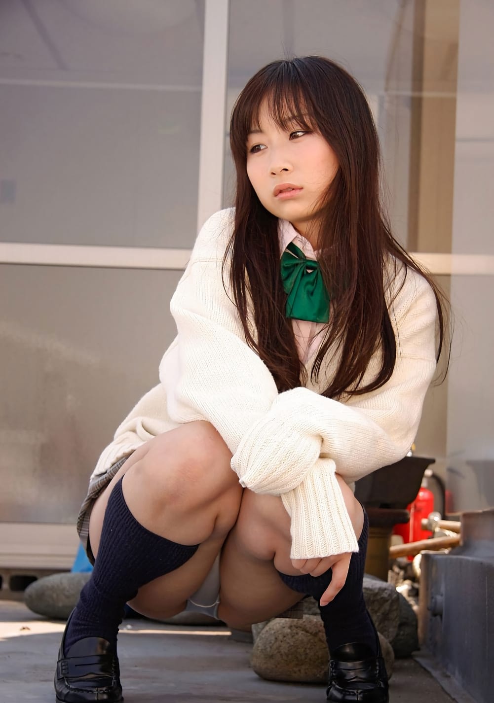 屋外で座り込んでパンチラする女子校生。