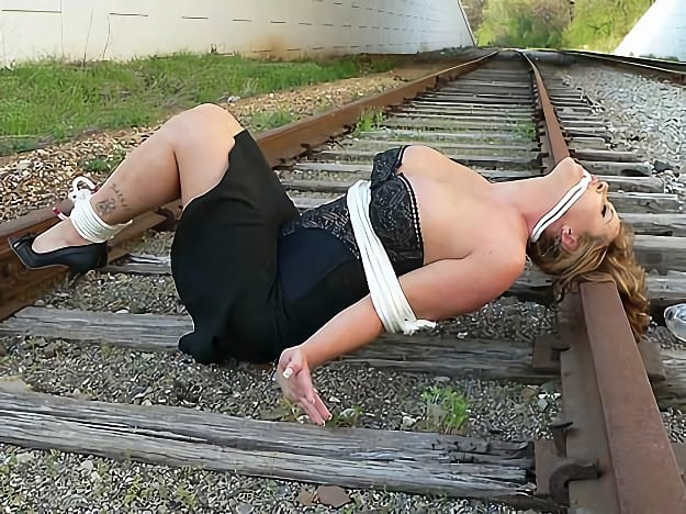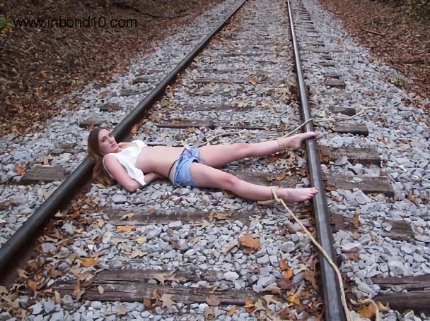 線路の上で手足を縛り上げられているスタイル抜群の外国人女性。