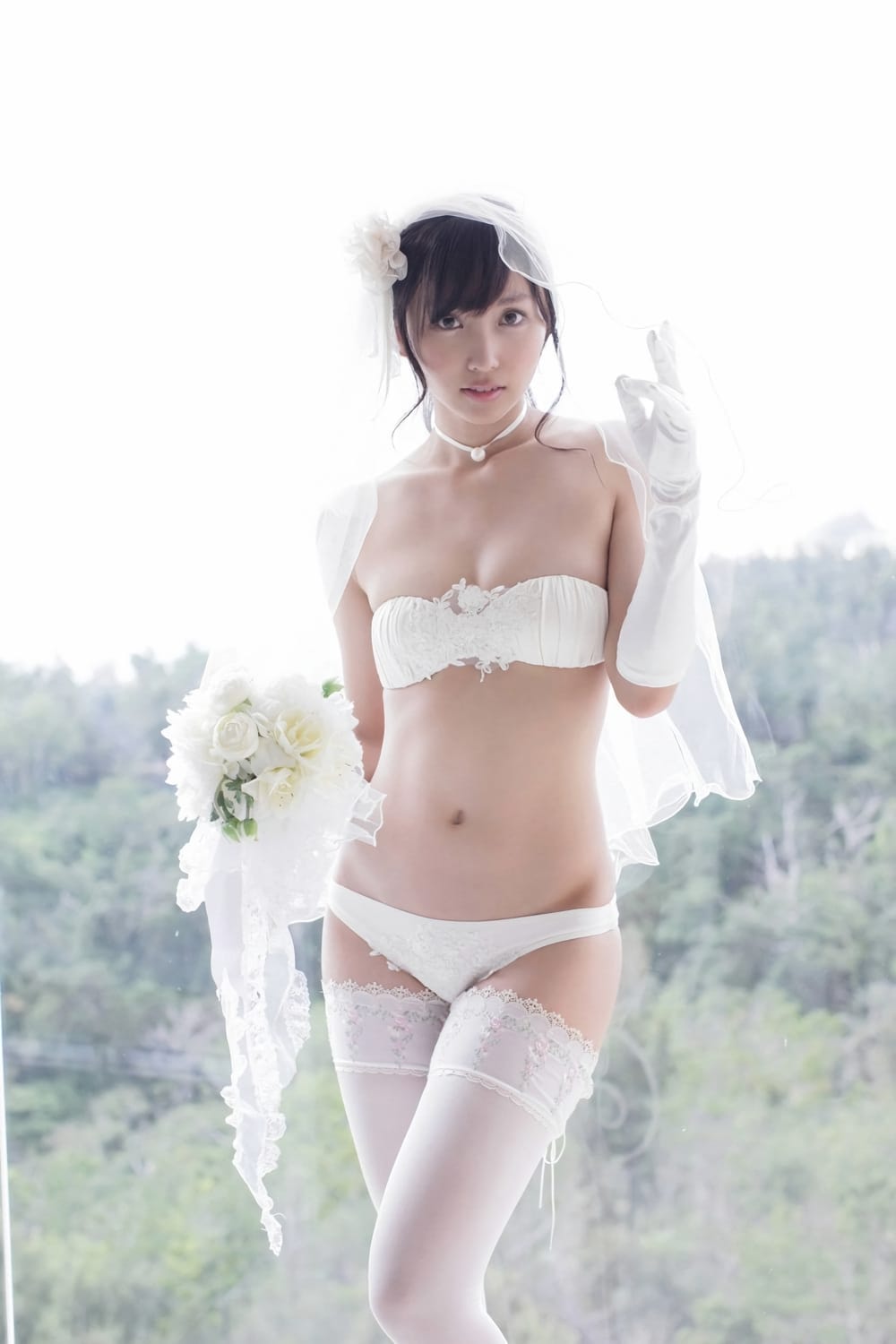 白い下着姿でブーケをt持つスレンダー美女